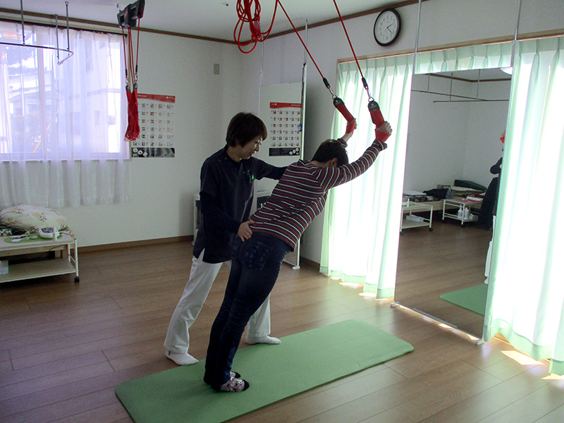 - レッドコード:ノルウェーで始まった機能訓練方法。天井からつるしたロープを使って、自分の体重を利用しながら、固まった関節や筋肉をほぐし、血流を回復させます。大館では初めての機能訓練です。